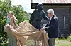 Tidligere ordfører Kåre Delviken og ordfører Kamilla Thue avduket det nye tilskuddet som Delviken har gitt i gave til bygdetunet.