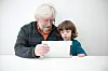 En bestefar viser barnebarnet sitt noe på en ipad.