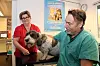 Espen Fjeldbu driver Grenseveterinæren selv, men også Solveig Holth (t.v.) er med og hjelper til. Her har hunden Chanel nettopp tatt blodprøve.