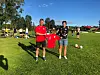 Trener for damelaget Martin Bonnerud og leder i Eidskog fotball Solfrid Brenna med sine lånte landslagsdrakter.