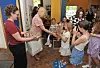 Ordfører Kamilla Thue gir blomster og gratulerer kulturskoleelev Hannah Slartmann Damholen.