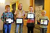 Hroar, Oline, Tor Kristian og Sigvart viser stolt frem noe av det de lagde på digitalt tegnekurs.