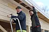 André Wrangell (t.v.) og Leif Harald Lindkjølen hamrer løs på den nye serveringsbua i Skøttruparken.